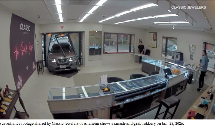 “Employees reported that multiple suspects intentionally rammed a dark-colored Nissan Rogue into the front of the business to gain entry and steal jewelry,” Anaheim police said. “During the burglary, the suspects also stole a firearm from behind the counter that belonged to the business.”