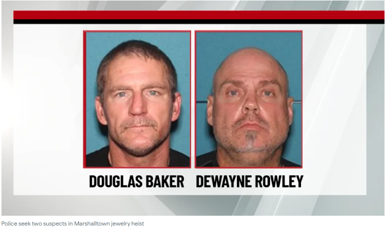 Online court records link Baker and Rowley to the burglary of Hellberg’s Jewelers at 13 W. Main Street in Marshalltown in the early morning hours of April 4th. An application for a search warrant claims the men were caught on camera casing the jewelry store ahead of the burglary. Vehicles associated with them were also visible in surveillance video.