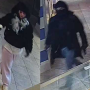 Suspect 2: described as female with a thin build approximately 5 foot 6 inches tall in her late 20s to early 30s. She wore white running shoes, light pink track pants. She wore a black winter jacket with a hood over top of a white T-shirt. The suspect appeared to have long hair dyed white or grey. She wore a black mask during most of the robbery but not all of it. She also wore black gloves