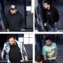 While the fourth man also has black hair and a beard and is wearing a turquoise t-shirt with a print on the front and jeans.